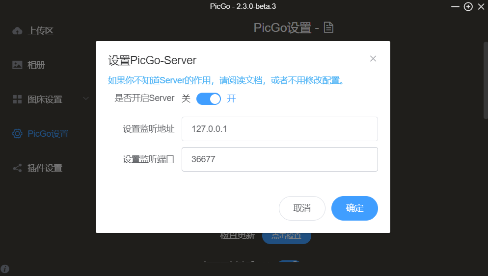4. 检查picGo的服务设置,点击picGo设置 —— 设置Server ——开启Server (默认是开)。如图